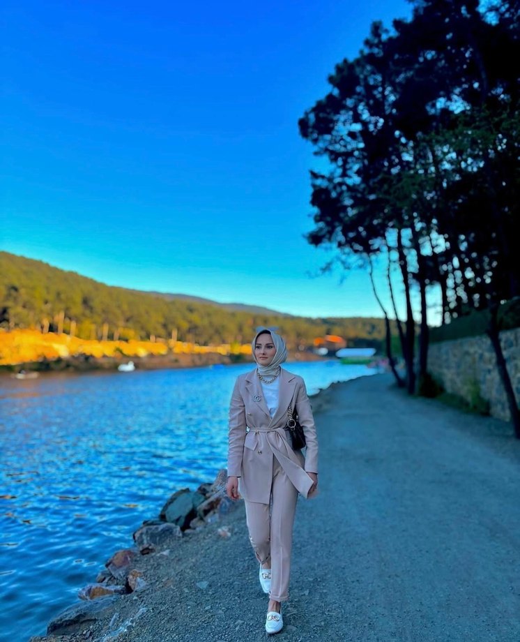 Kadın takımı, camel renginde, ipeksi dokuda ve drapeli tasarıma sahip. Notlu yaka ve uzun kollu, modest, regular fit ve uzun boyda, günlük kullanım için uygun. Etnik desenlerle streetwear tarzı iş kıyafeti.