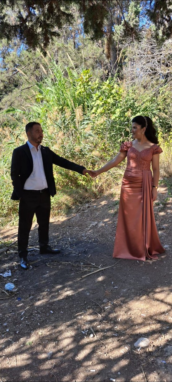 Camel renkli, uzun straplez nişan elbisesi. Kısa kollu, drapeli ve etnik desenli. Parlak dokusu ve klasik modern tarzıyla şık ve göz alıcı.