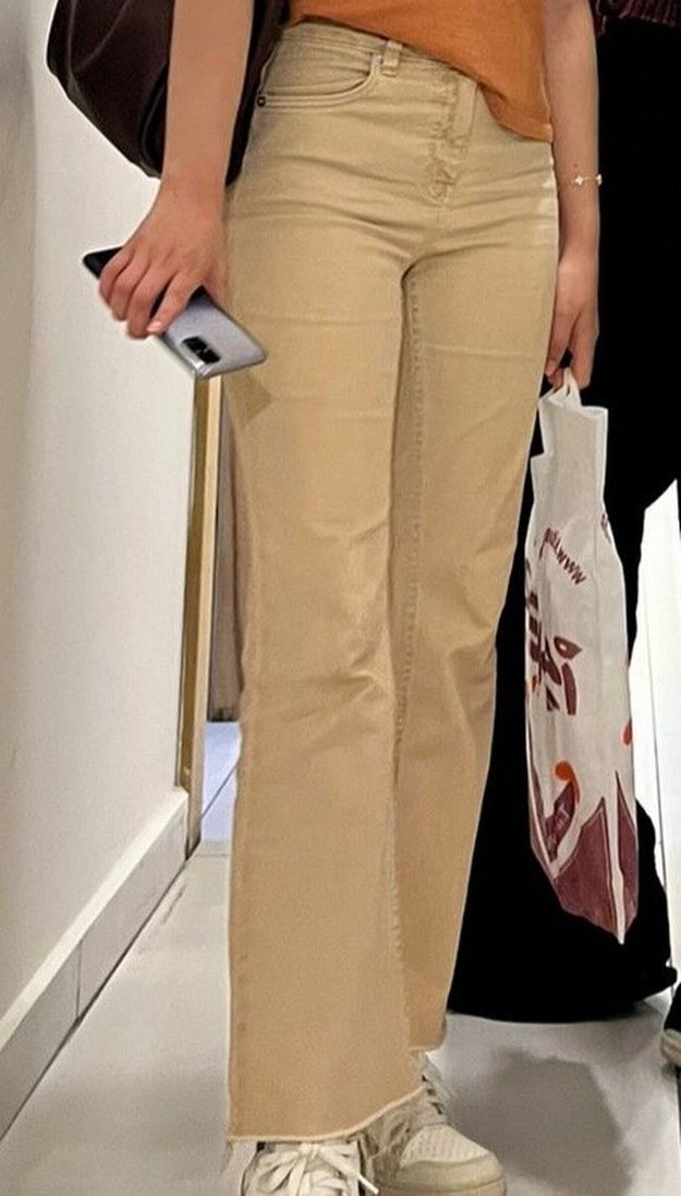 Açık camel renkli, bol kesim ve midi boy kadın boyfriend denim pantolon, rahat ve şık bir dış mekan görünümü sunar.