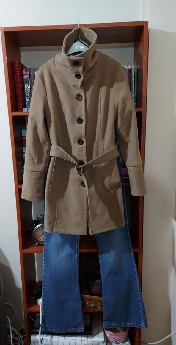 camel kumaştan yapılmış, kemerli ve uzun kollu, kesik yaka detaylı, rahat kesime sahip midi kadın kaban. Trend sokak stili için uygundur. ic astari yirtildi dikildi baska sorunu yok