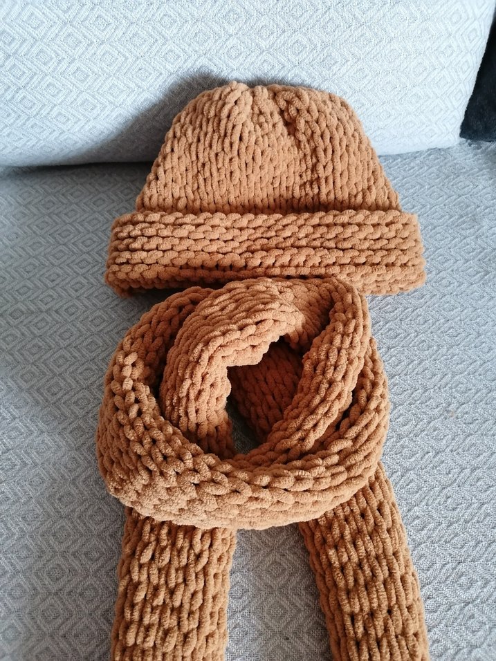 Yumuşak el emeği örgü ile yapılmış, düz tasarımlı, camel renkli bere ve atkı seti. Rahat ve sıcak tutar.