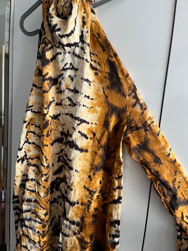 Parlak camel renkli, batik desenli ve bohem tarzda, drapeli rahat bir kedi giysisi.