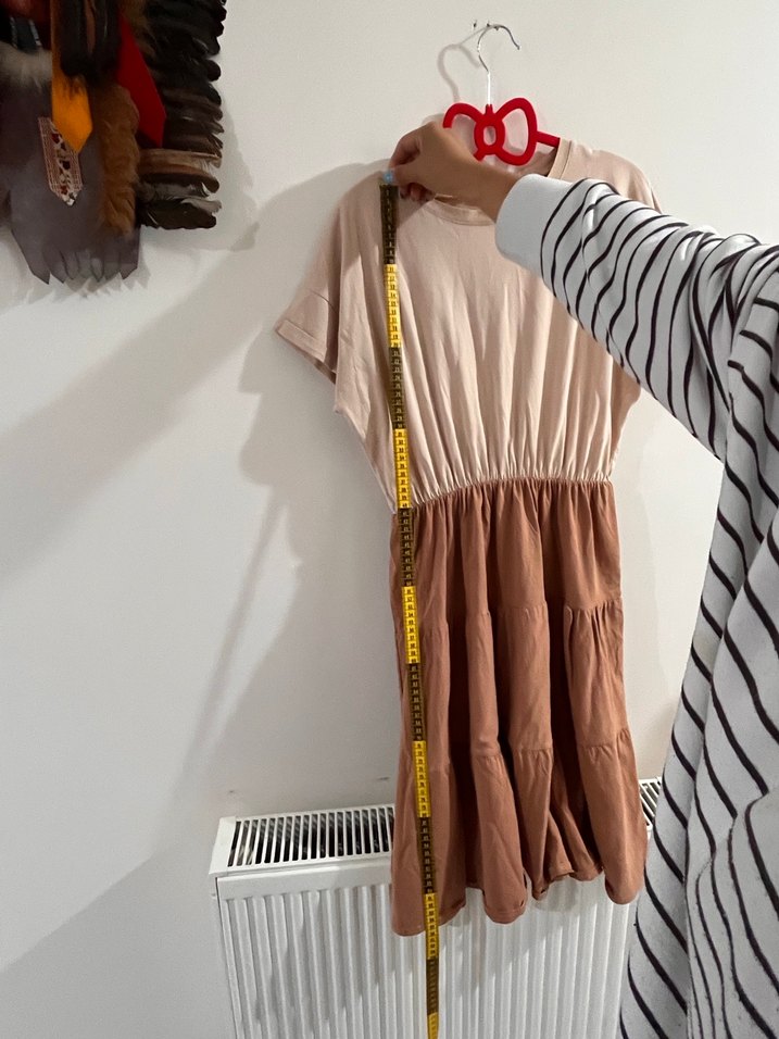 Yüksek yakalı ve pilili detaylara sahip, pastel camel renkli bol kesim hamile elbisesi. Yumuşak tekstil kumaştan, günlük sokak stili için uygun.