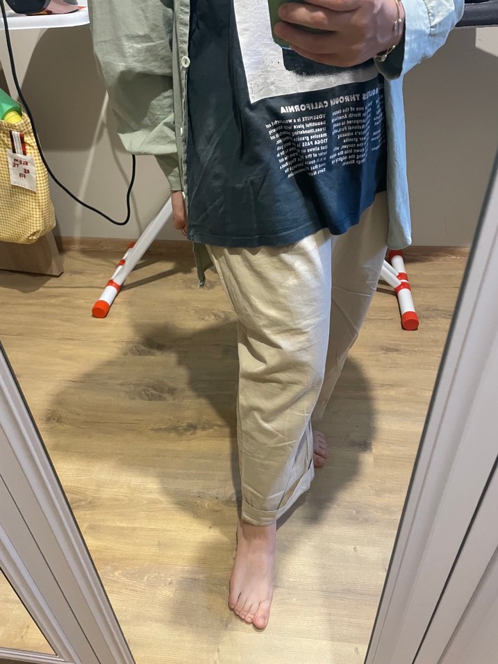 Tamamen pamuk camel renk pantolon boru paça 38 beden civarında biraz kullandım hala çok güzel.