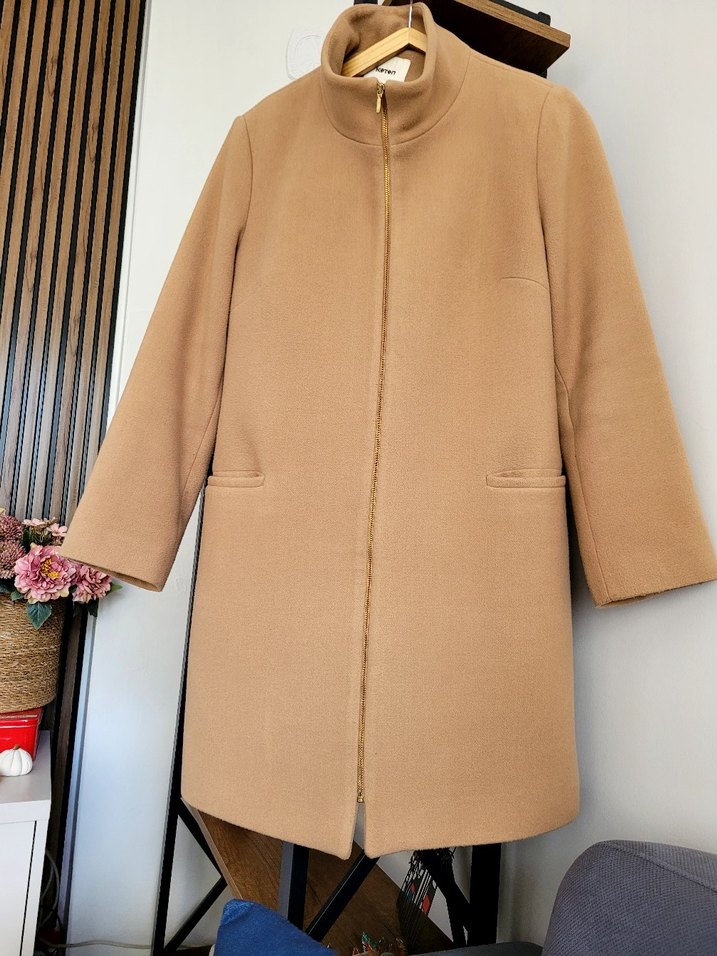 Camel renkli kaşe kaban, klasik kesim, dik yaka ve yan cepler içerir. İç kısmı astarlı ve fermuarlı kapanışlıdır.