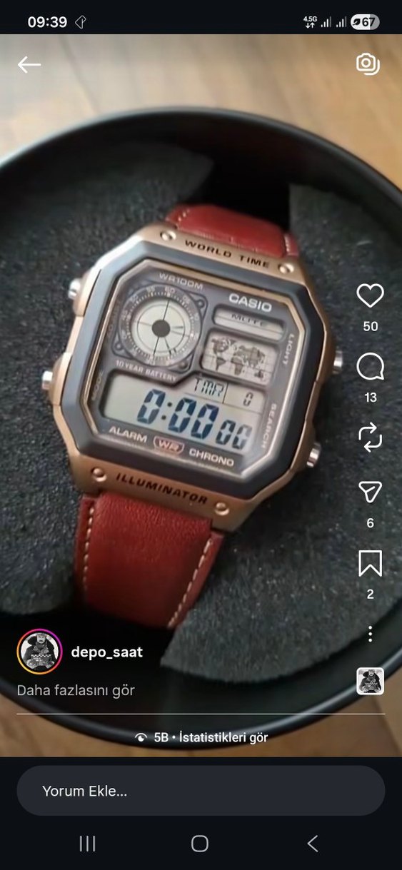 Camel renk deri kayışlı Casio erkek kol saati, vintage dijital ekran, dünya zamanı, alarm ve kronometre özelliklerine sahiptir. Karanlıkta okunabilirlik için aydınlatıcı bulunur. ⌚