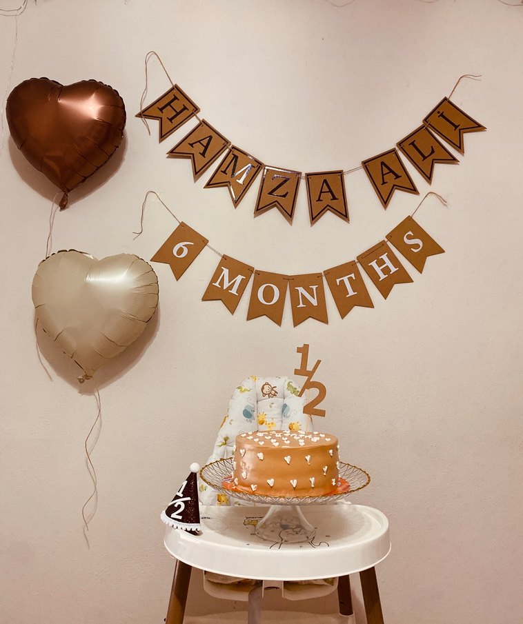 Camel renkli, beyaz harfli isim ve "6 MONTHS" yazılı parti süsleri, yarım yıl kutlamaları için uygundur. 6 ay şapkası da mevcuttur balonlar satılık değil