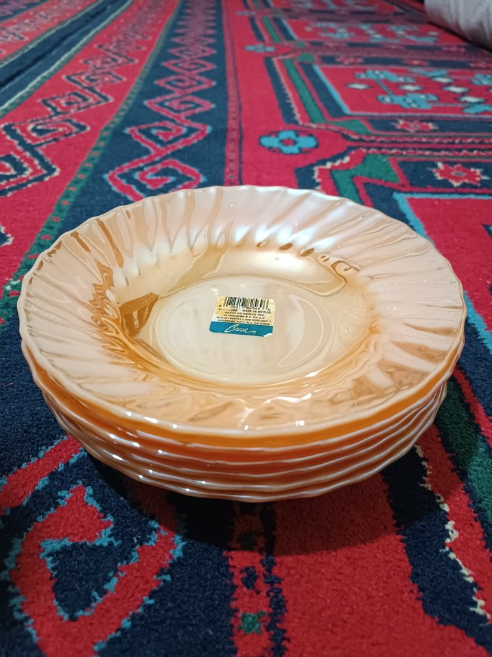Altı adet camel renginde, parlak ve düz yüzeye sahip yemek tabağı seti. Yemek servisi için uygun, sade ve şık tasarım. ️