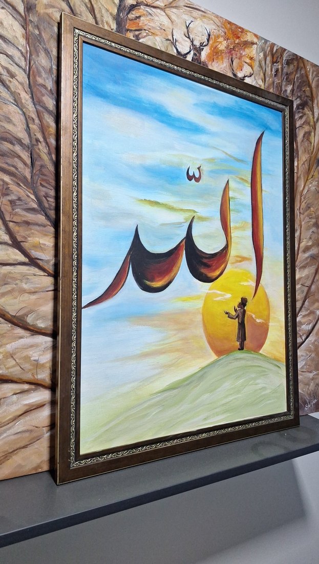 Bu tabloda camel tonlarında 'Allah' yazısı, mavi tonlarında gökyüzü ve ufka yakın büyük bir güneş yer alıyor. Tepe üzerinde bir figür yukarı bakıyor.