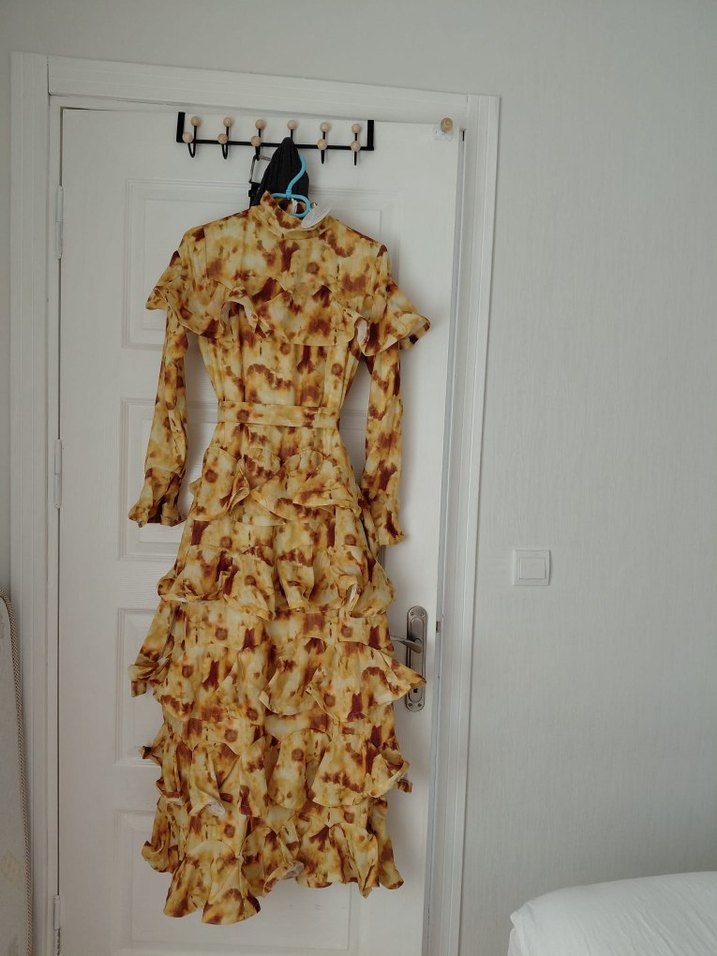 Yüksek yakalı, fırfırlı ve salaş kesimli camel renkli uzun elbise, bağlamalı askıları ve vintage tie-dye deseniyle bohem tarz sunar. sadece fermuari takıldı yaptırmadım üzerime olmadı etiketli ürün