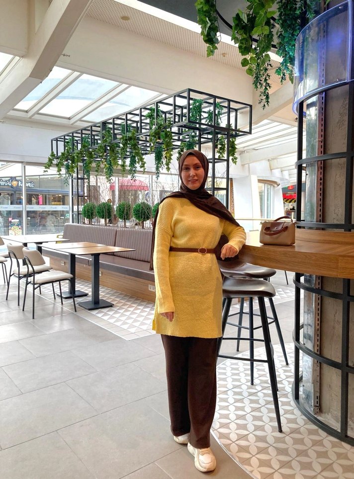 Camel renginde, boğazlı ve uzun kollu triko tunik. Etnik desenlere sahip, midi boyda, rahat kesim ve günlük kullanıma uygun rahat bir model.
