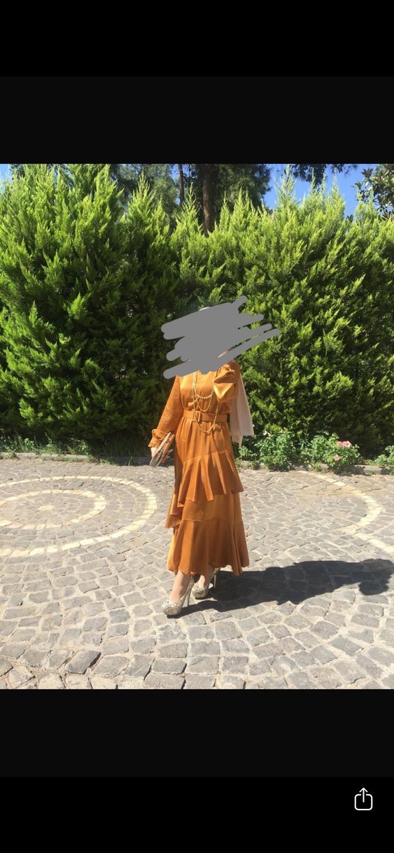 Hardal renginde, parlak sentetik kumaştan yapılmış, yüksek yakalı ve askılı kollu bohem tarzda, dökümlü ve bol kesim uzun kadın elbisesi. Açık hava kullanımı için uygundur.