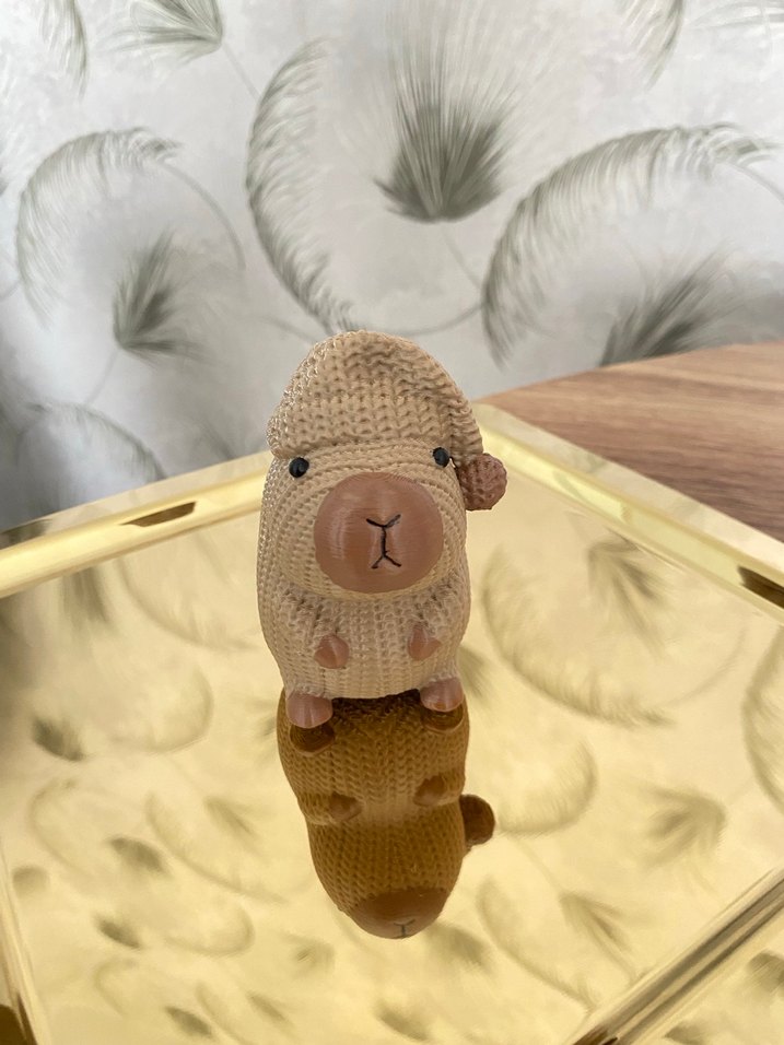 Örgü dokulu, küçük detaylara sahip camel renkli oyuncak.