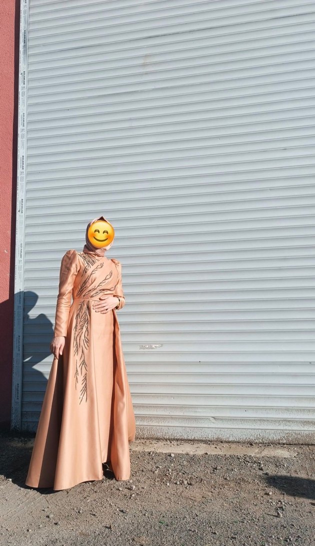 Parlak camel renkli, yüksek yakalı ve uzun kollu, drapeli detaylara sahip, ipeksi kumaştan uzun elbise. Düğün ve sade şıklık için uygundur.