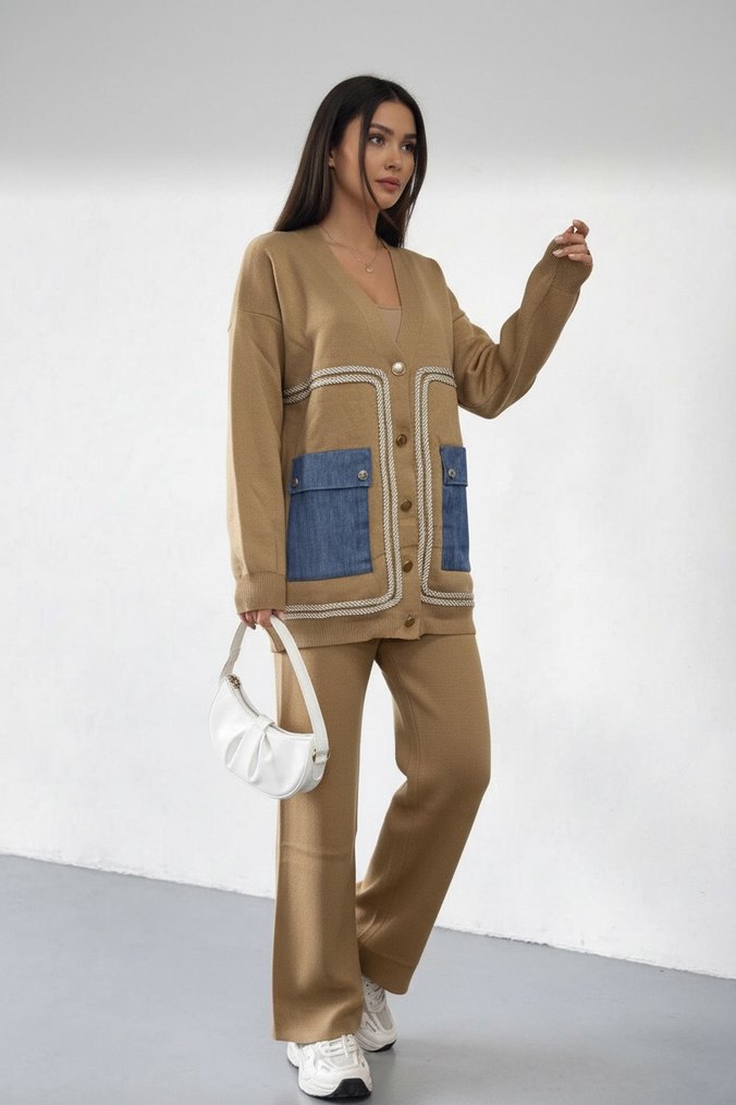 Düğmeli ön kısmı ve kot detaylı cepleri olan camel renkli kadın takımı. Uzun kollu, yakalı ve günlük rahat kullanım için regular fit.