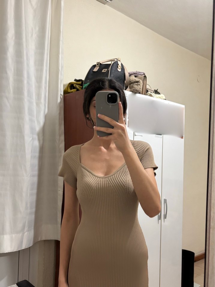 Düz kesim camel renkli, vücudu saran hem günlük hemde şık kullanıma uygun bir elbisedir. Xs-S beden rahatlıkla kullanabilir