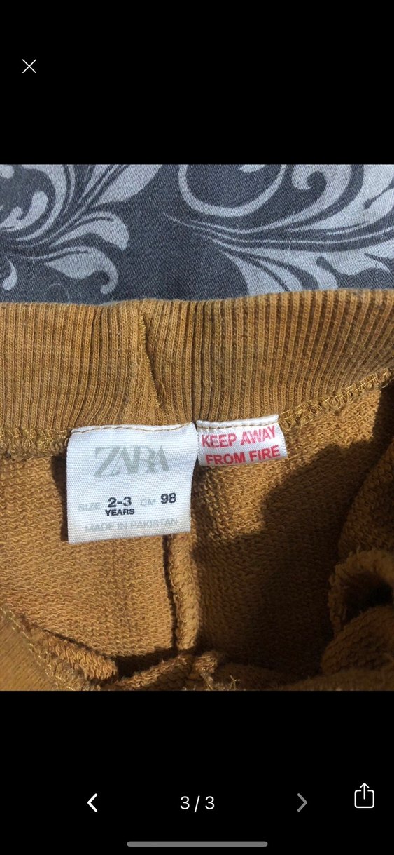 2-3 yaş erkek çocuk için camel renkli, rahat kumaşlı pantolon . Üzerinde "KEEP AWAY FROM FIRE" etiketi bulunur. Pakistan'da Zara tarafından üretilmiştir.