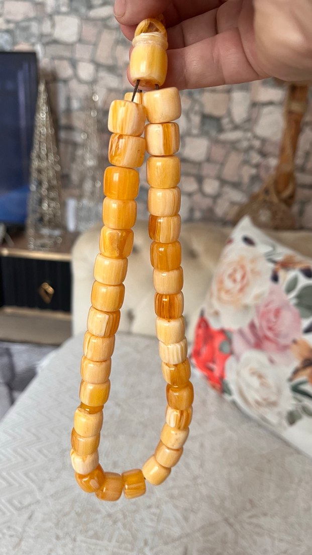 Camel renkli, renkli ve bohem tarzda erkekler için klasik tesbih. Boncuklar parlak ve pürüzsüz bir yüzeye sahiptir.