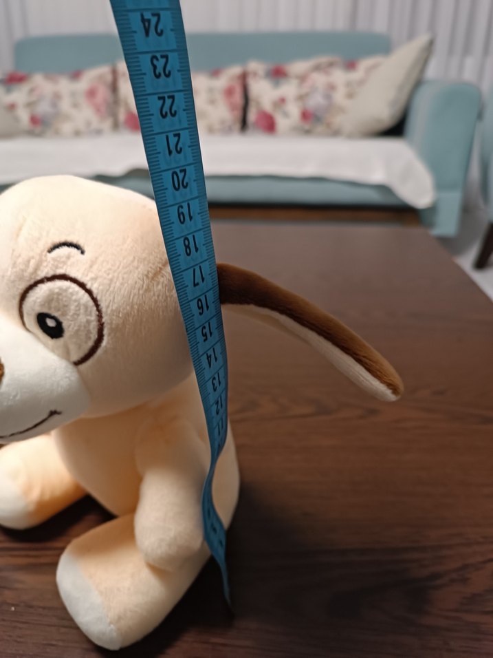 Camel ve gri renkte, yumuşak kumaştan yapılmış, yaklaşık 20 cm yüksekliğinde peluş oyuncak köpek.