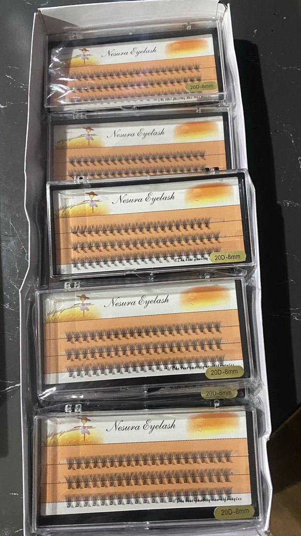 Nesura Eyelash markasına ait, yaklaşık 8mm uzunluğunda çeşitli boylarda, hafif camel renkli takma kirpikler.