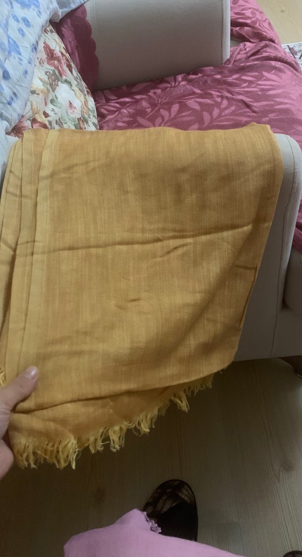 Camel renkli kadın keten şal, yumuşak kumaştan ve drapeli stilde. Parlak görünümü ve püsküllü kenarlarıyla bohem tarzı yansıtıyor.