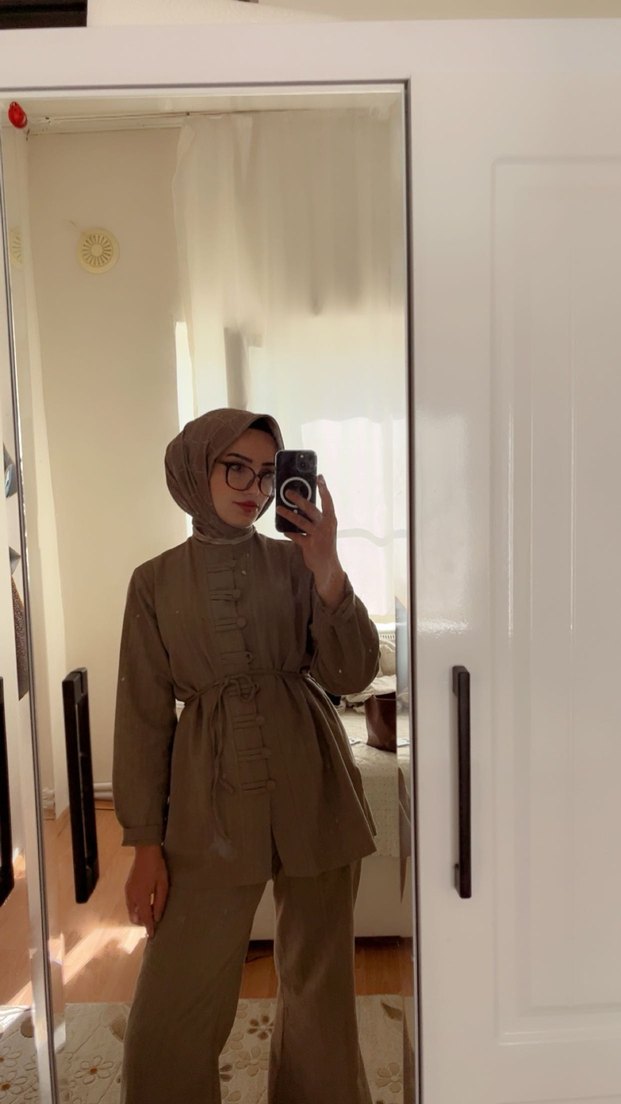 Pamuk kumaştan, uzun kollu ve yüksek yakalı, camel renkli kadın midi takımdır. Minimalist ve sade tasarımıyla günlük kullanıma uygundur.