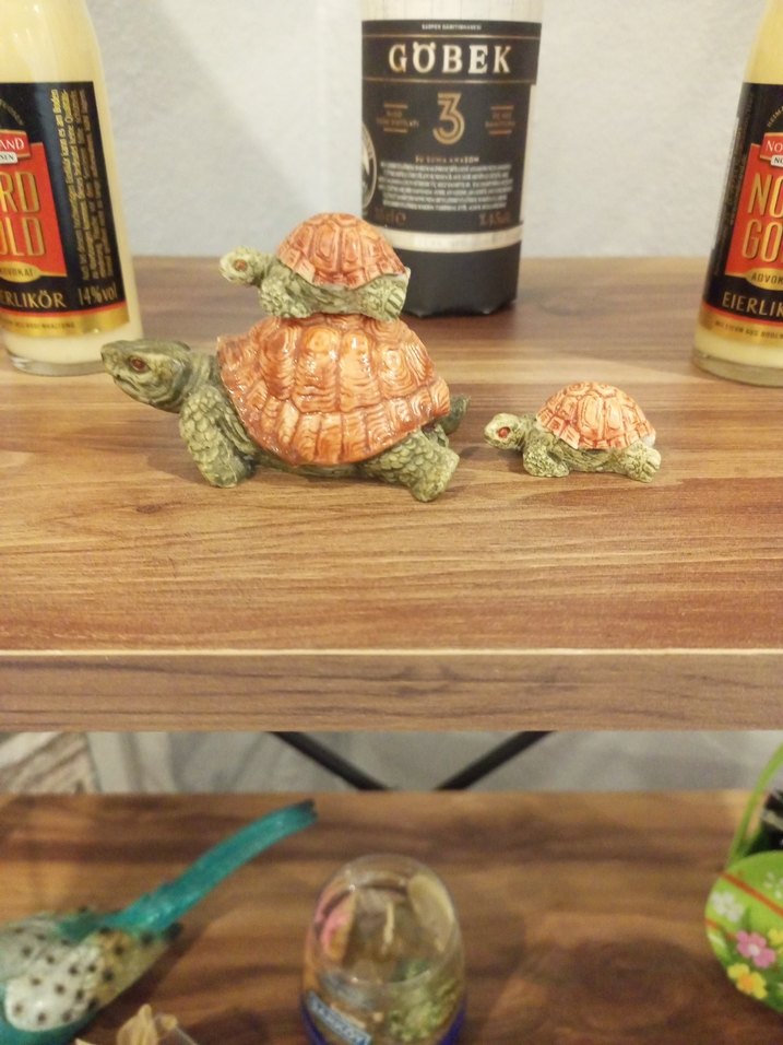 Detaylı dokulu pastel camel renk kaplumbağa figürleri, büyük, orta ve küçük boyutlarda üst üste yerleştirilmiş .