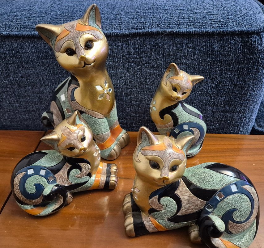Camel renkli, koyu ve canlı desenlere sahip, sanatsal desenlerle süslenmiş , taşlı ,parlak yüzeyli kedicik figürleri seti.2 adet kaldı. İster tek tek ister set halinde yurt dışından aldığım biblolar.