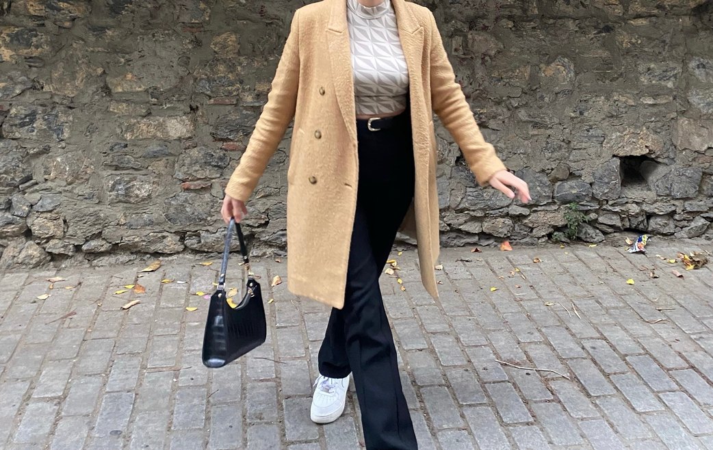 Camel renkli, uzun kollu kaban. Normal kesim ve midi boyda
