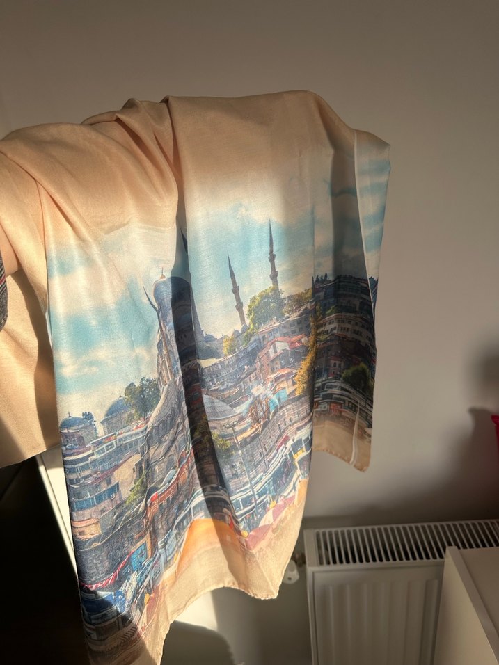 Camel renginde, pamuk dokulu, drapeli şehir manzaralı şal, mütevazı sokak tarzına uygun.