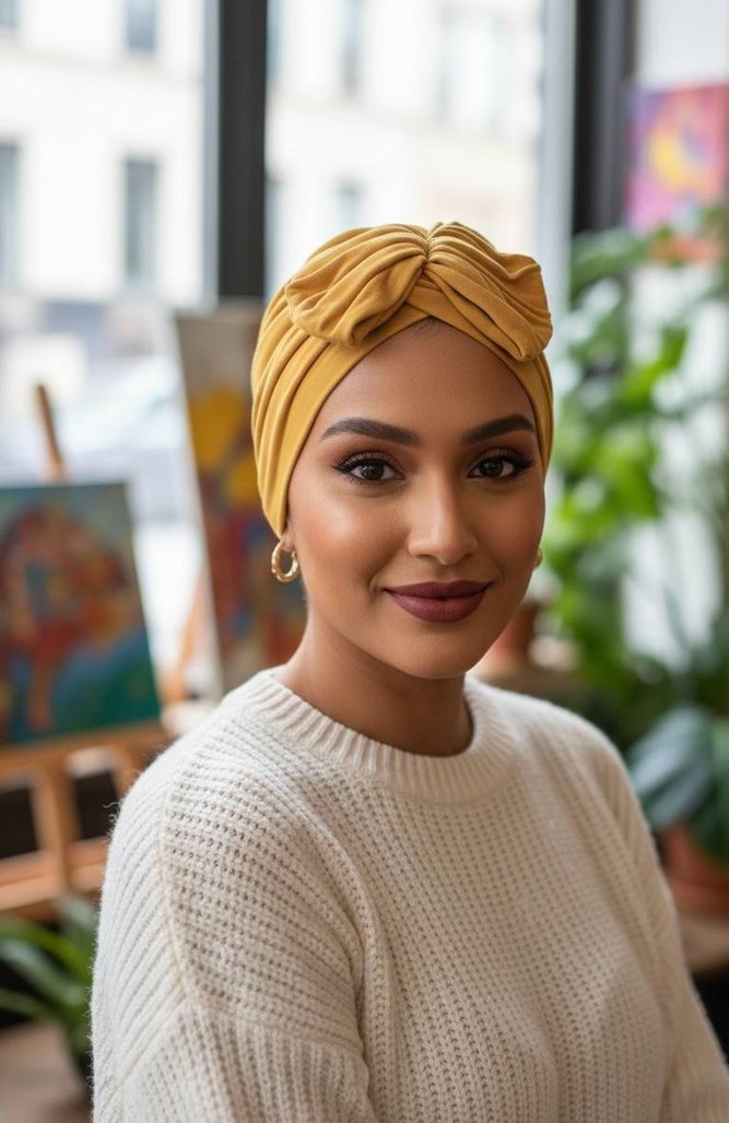 Hafif camel renginde, pamuklu, bohem tarzda drapeli kadın bone, rahat ve mütevazı bir kullanım sunar.