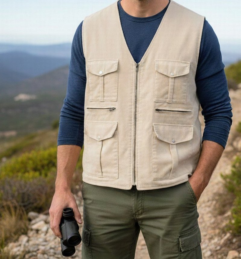 Pamuk kumaştan üretilmiş, kemerli, çok cepli, normal boyda, regular fit ve bisiklet yaka erkek yelek. Hafif camel rengindedir, rahat ve şık bir dış giyim seçeneği sunar.