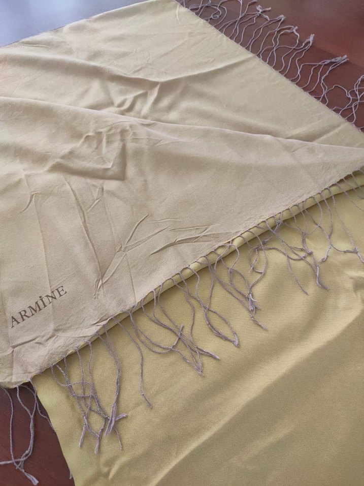 Camel renginde, saten dokulu, püsküllü kenarlara sahip kadın şalı. Parlak kumaşı bohem ve şık bir görünüm sunar. Marka: ARMiNE.