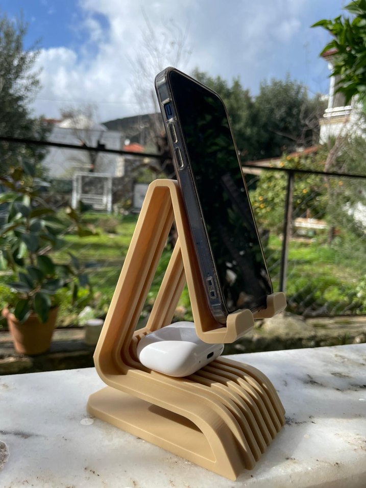 Camel renkli telefon tutucu, kablosuz kulaklık için yuva ile cihazlarınızı düzenli tutar.