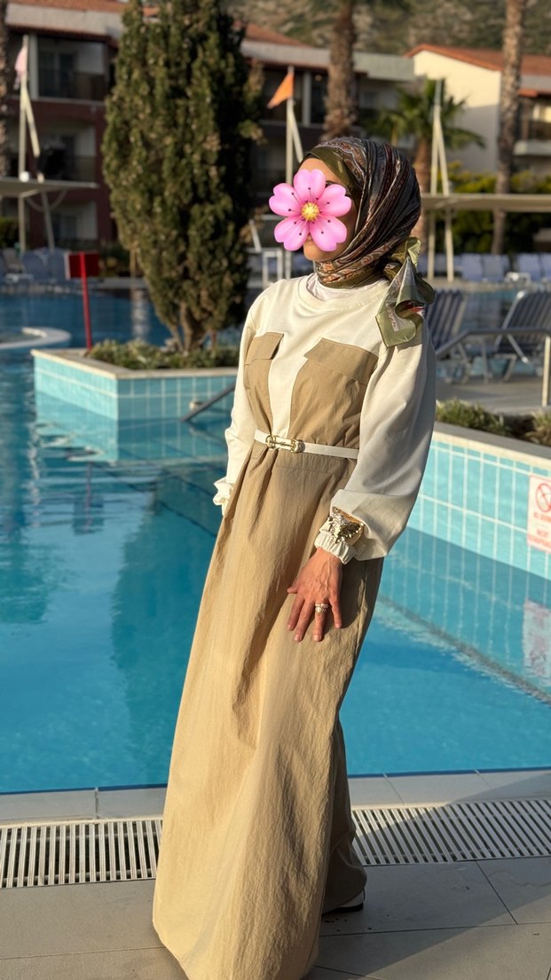 Uzun, bol kesim elbise, yüksek yakalı ve askılı kollu, hafif camel tonunda. Yumuşak sentetik kumaştan, mütevazı bohem tarzı için uygun.