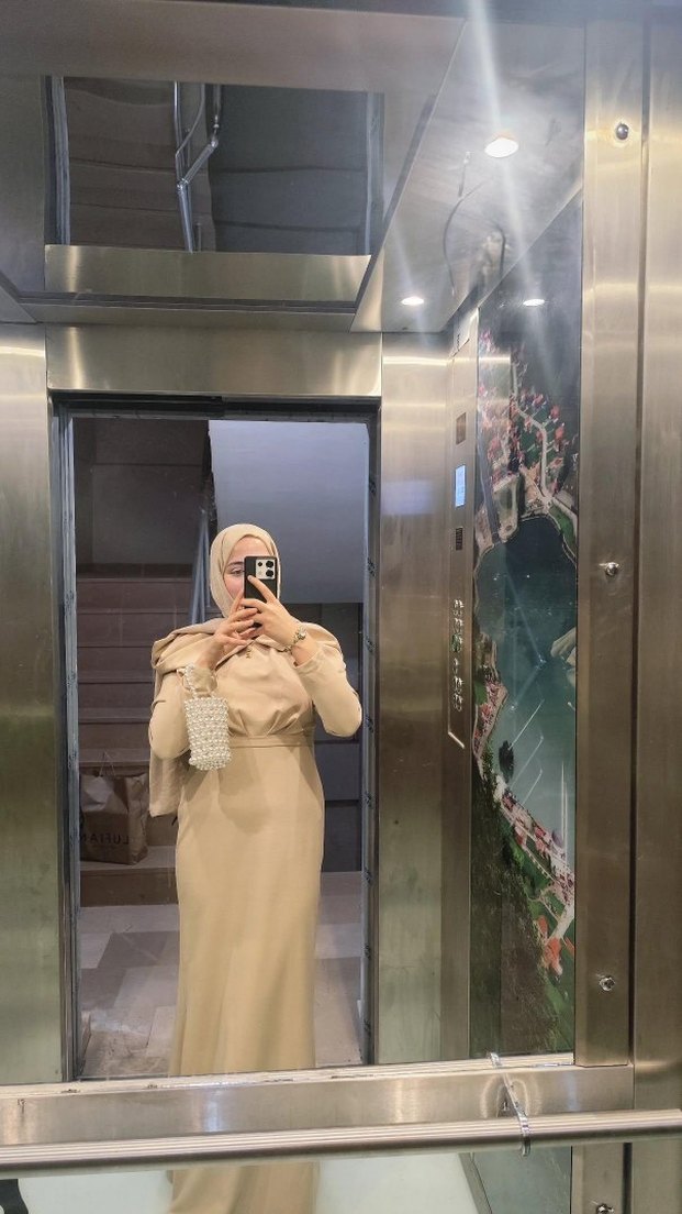 Camel renkli uzun elbise, yüksek yakalı ve uzun kollu, ipeksi kumaştan drapeli tasarımla sade ve mütevazı stil sunar. Günlük kullanım için uygundur.