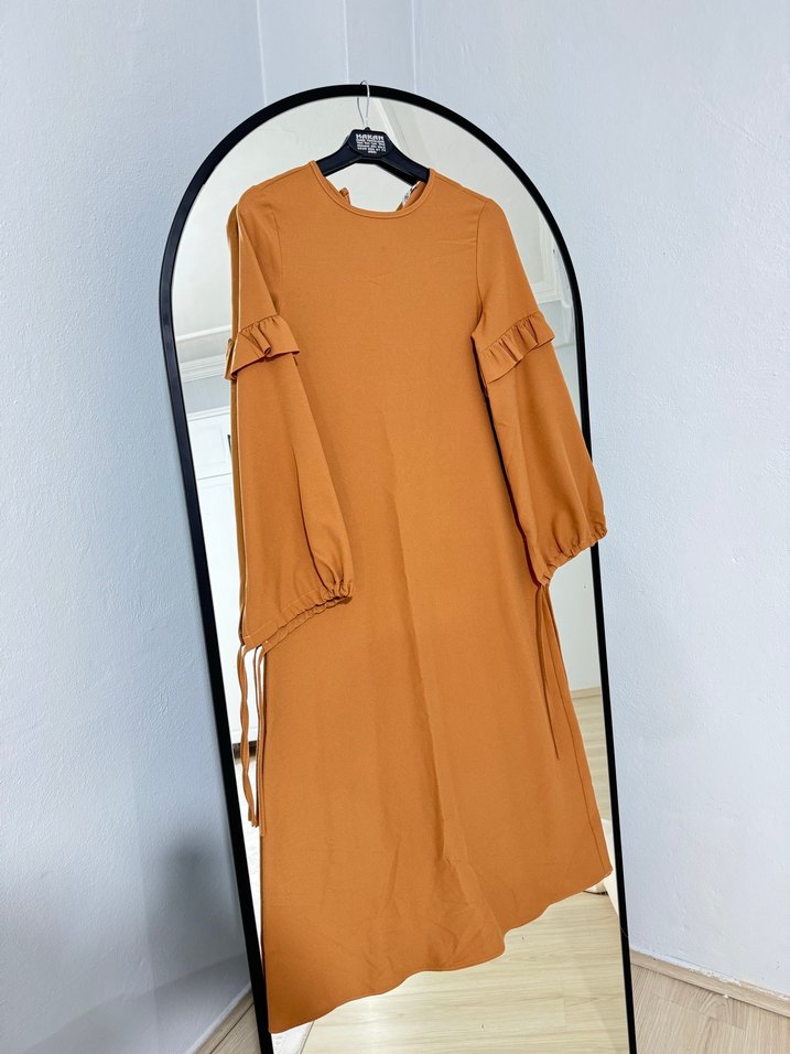 Camel renkli, uzun kollu ve salaş kesim elbise. Kollarında fırfır detayları ve yuvarlak yaka bulunur. Parlak sentetik kumaştan yapılmıştır.