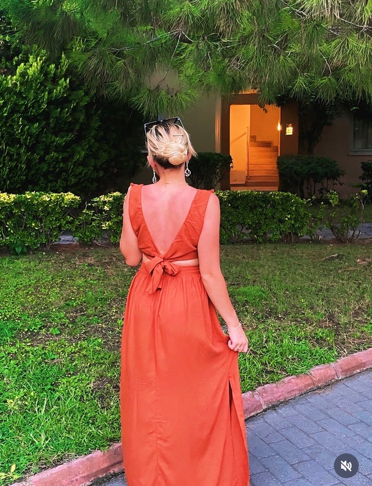 Camel renkli, V yakalı ve kolsuz uzun elbise. Belden kemerli, oturan kesimli ve batik desenli. Bohem tarzı ve düğünler için uygun.Sadece 1 defa giyilmiştir.