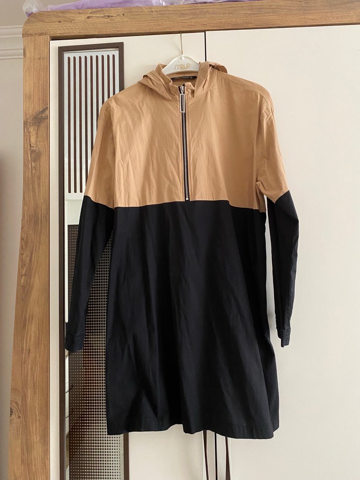 Camel ve siyah renk bloklu, yüksek yakalı ve fermuarlı rüzgarlık. Uzun kollu ve bol kesim, günlük kullanıma uygun sentetik kumaş.