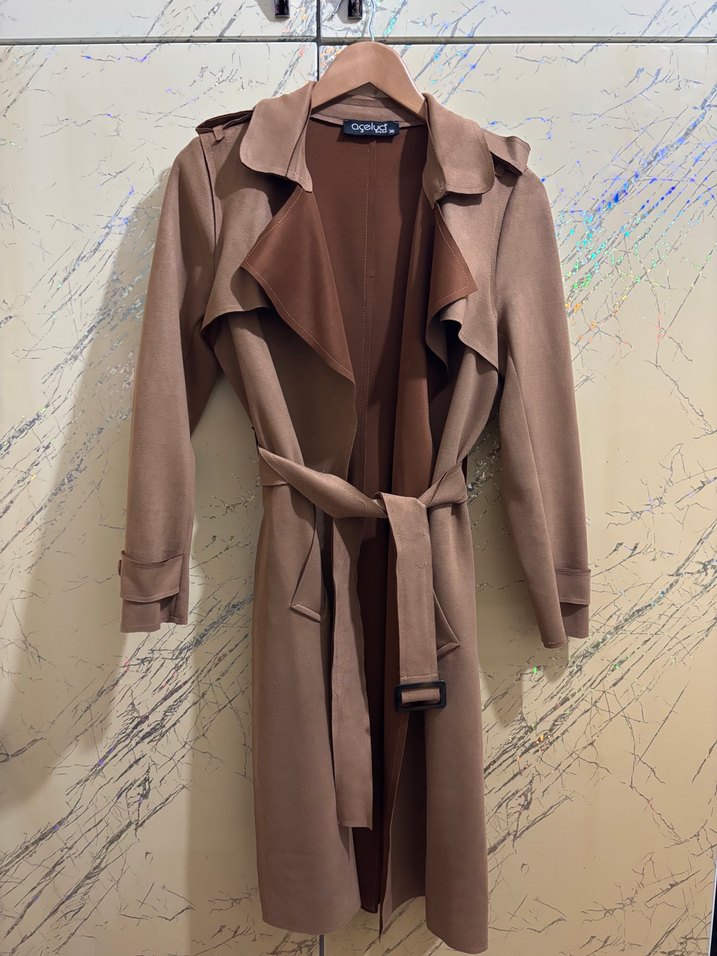 Bej renkte uzun süet trençkot, yakası kesik ve askılı kolludur. Kemerli ve regular fit yapısıyla ofis için uygundur, Paris sokak modasına uygundur.