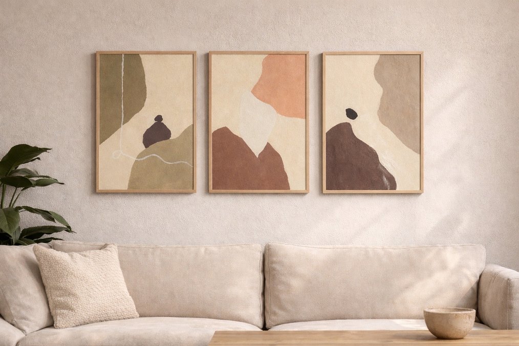 Camel tonlarında pastel renklerle soyut desenler içeren üçlü tablo seti, sade ve modern bir atmosfer sunar. 14.8 *21 cm ölçülerinde soyut resim. Çerçevesiz 3 adet fiyatıdır. Marka temsilidir.