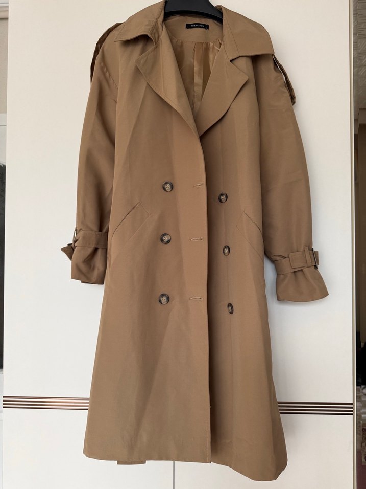 Camel renkli, uzun kesim kadın trençkot, düğmeli ve yaka detaylıdır.Milladan alındı marka temsili koydum. S-M-L uyumludur.sadece 1 defa giyildi defosu yoktur.kuşaklı ve kolları ayarlanabilir