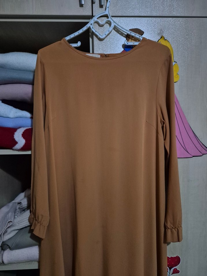 Camel renk, uzun kollu ve salaş kesime sahip, ipeksi dokulu drapeli tunik. Günlük rahat sokak stili için uygundur.