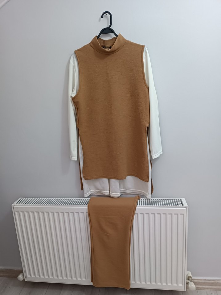 Uzun boylu camel tunik, yüksek yakalı ve kolsuz tasarımıyla, uzun kollu iç giyimle kombinlenmiş, sade ve rahat bir görünüm sunar.
