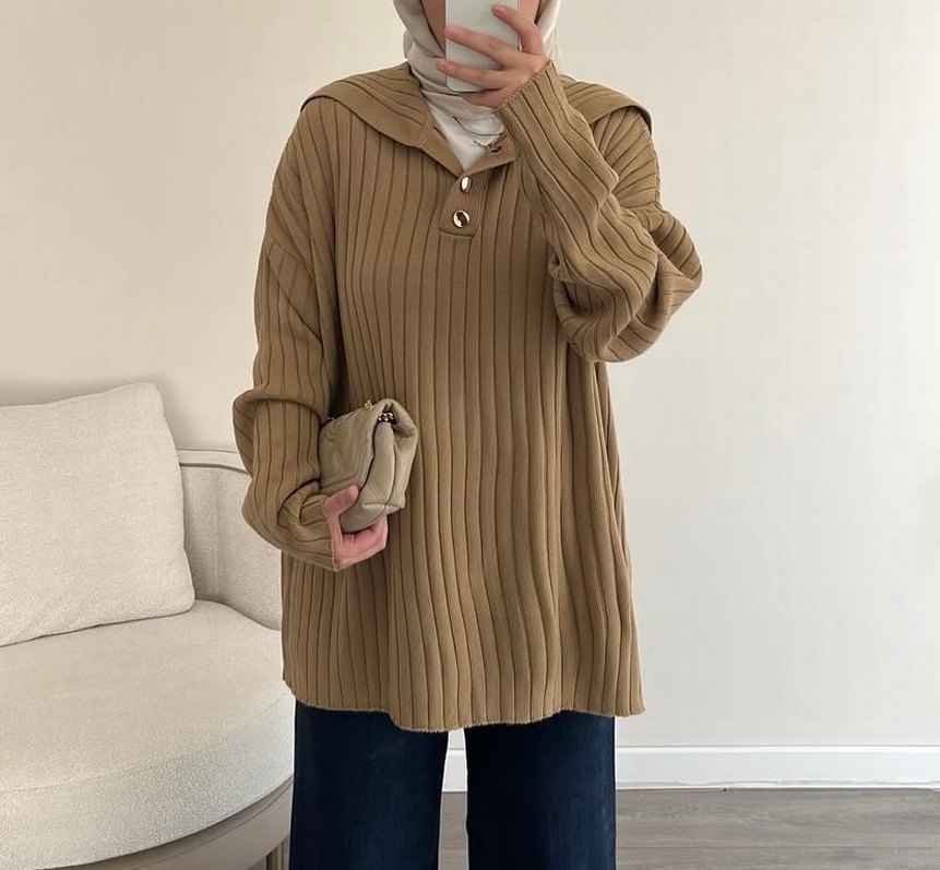 Camel renkli, yüksek yakalı, uzun kollu örgü kazak. Salaş kesimi ve düğme detaylarıyla günlük sokak stiline uygun rahat bir parça.