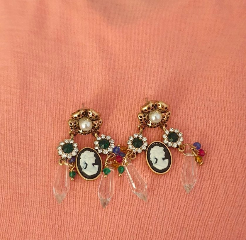 Nakışlı ve boncuklu detaylara sahip, pastel çok renkli kısa uzunlukta küpe