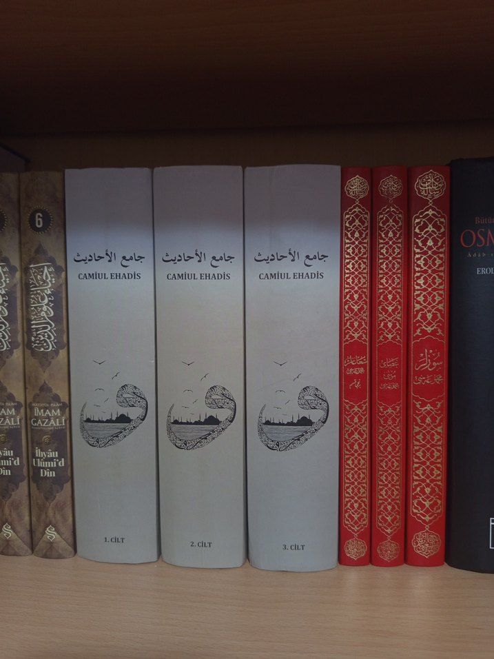 Bu set, detaylı dini metinler içeren Camiu'l-Ehadis'in üç cildini içerir. Kitapların beyaz kapakları ve Arapça yazılı sırtları vardır.