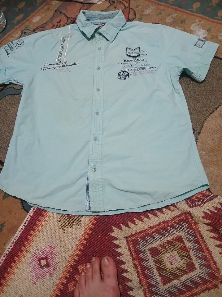 Turkuaz renkte, kısa kollu, düğmeli, yakalı ve bol kesim erkek gömleği. Sentetik kumaştan üretilmiş, rahat sokak stili için uygun. CAMP DAVID XL UYUMLUDUR.DAR KESIM EKOSELI ERKEK ORJİNAL GÖMLEK ÜRÜN TEMIZ DURUMDA LÜTFEN BENİM OLCULERIMI GÖZ ÖNÜNE ALARAK SİZİNDE ÖLÇÜLERİNİZ UYUM SAGLIYORSA ALINIZ. BOY 72CM.KOLTUKALTI 53 CMDİR KALİTELİ ÜRÜN UYGUN FIYATTIR