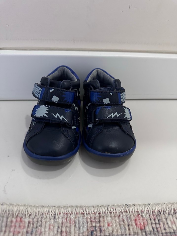 Koyu mavi renkli, cırt cırtlı bantlara ve kauçuk tabana sahip, rock punk tarzında erkek bebek ilk adım ayakkabısı. Resimlerde 2 yerinde küçük deformeler var