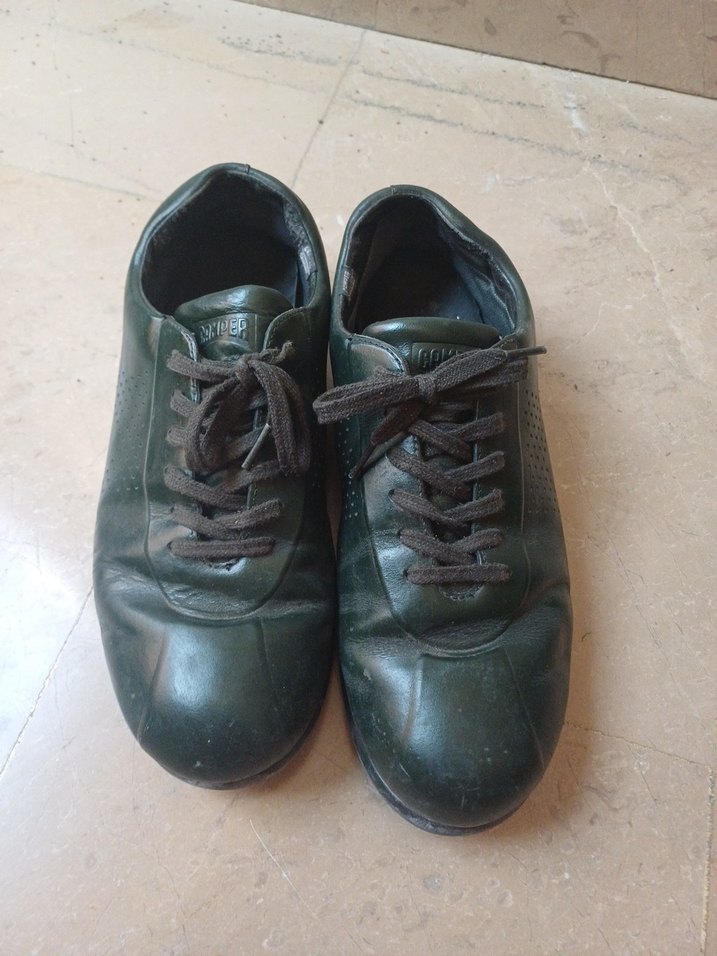 Koyu yeşil renkte, siyah bağcıklı erkek ayakkabısı, minimalist sokak stiliyle uyumlu. Camper marka koyu yeşil renk ayakkabı 44 numaraya uyumludur kullanılmıştır fakat kullanıma engel bir deformesi yoktur.